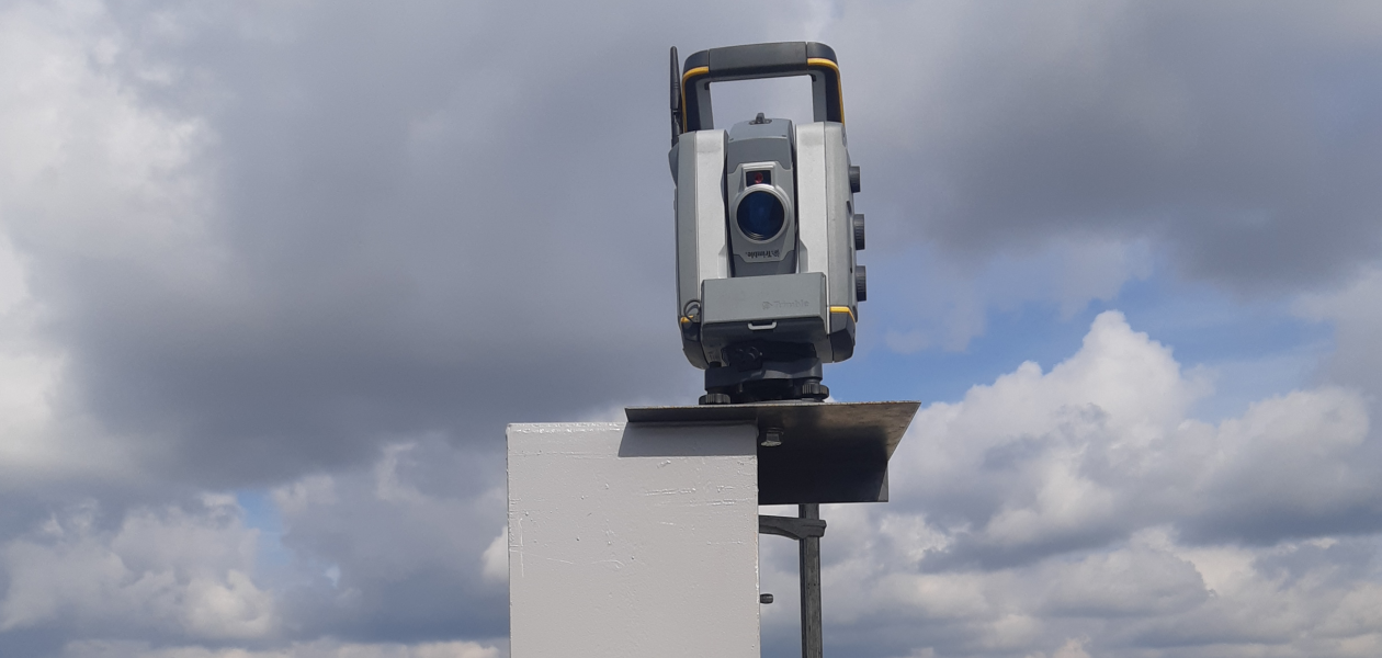 Unser Foto zeigt unser Tachymeter in luftigen 8m Höhe beim Aufmaß einer der beiden Schienen. Eine eigens für diesen Zweck angefertigte Stahlplatte diente der sicheren Befestigung.