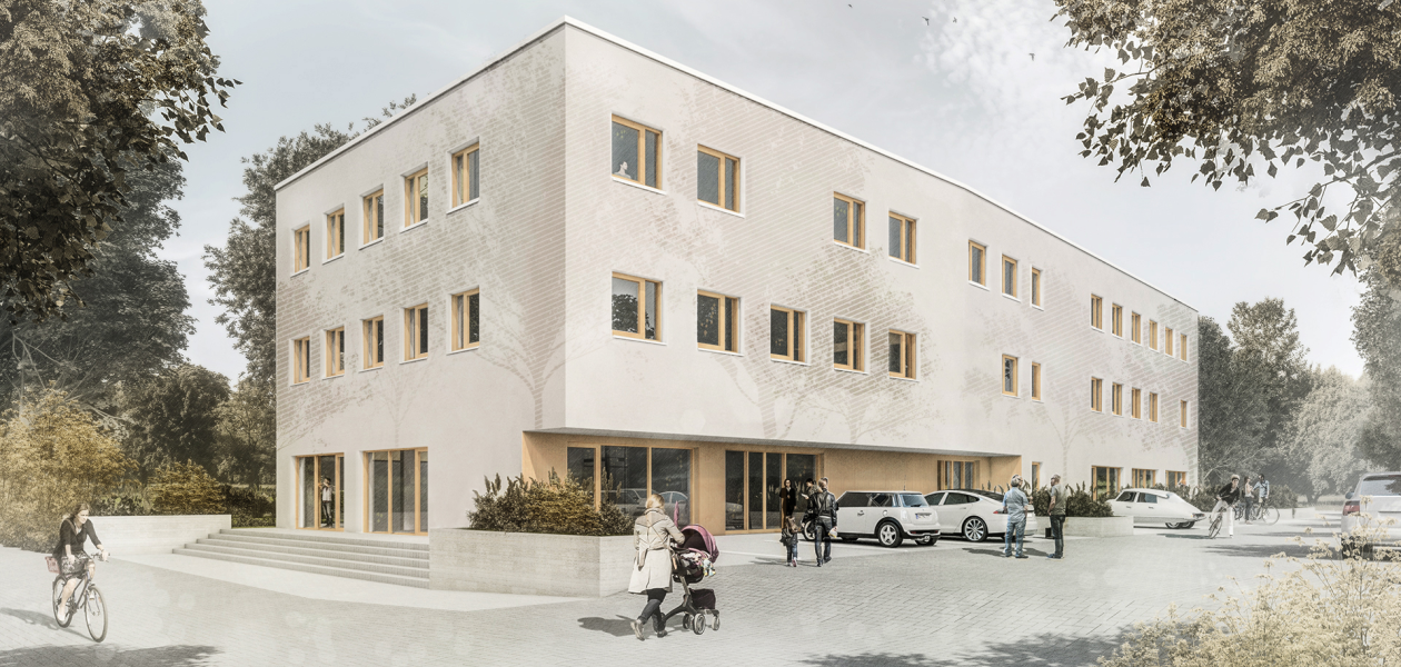 Gesine Schmidt, die verantwortliche Architektin, erläutert das Konzept: "Der dreigeschossige Baukörper bildet den städtebaulichen Abschluss zum benachbarten Krankenhaus. Es entsteht ein Gebäudeensemble mit einem öfftenltichen Zwischenraum, einem Platz mit Verweil- und Vorfahrmöglichkeiten." Die Gebäudekubatur des Neubaus verspringt im Bereich des Erdgeschosses. Dadurch wird die Erschließungszone betont, die gegenüber vom Klinik-Haupteingang liegt. Über den Eingang erreicht man die Praxen in den Obergeschossen sowie die komplementärmedizinischen Nutzungseinheiten im Erdgeschoss. Um die Gewerbeeinheiten im Erdgeschoss außerhalb der Öffungszeiten der Praxen zugänglich zu machen, befinden sich deren Haupteingänge an der Außenfassade Richtung Bahnhofstraße und Platz.